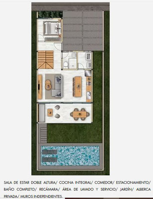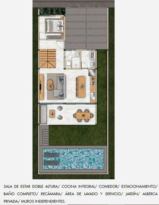Sala con doble altura, comedor doble atura, cocina integral doble atura, 1 baño completo, recámara 1, jardín, alberca de 26m2, área de lavado y estacionamiento para 2 autos.