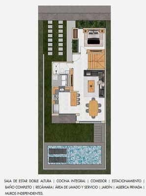 Sala doble atura, comedor doble altura, cocina integral, 1 baño completo, amplia recámara, estacionamiento, jardín, alberca de 26m2, área de lavado