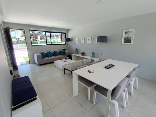Estacionamiento para dos autos a frente de la casa, sala, comedor, cocina, medio baño, terraza.